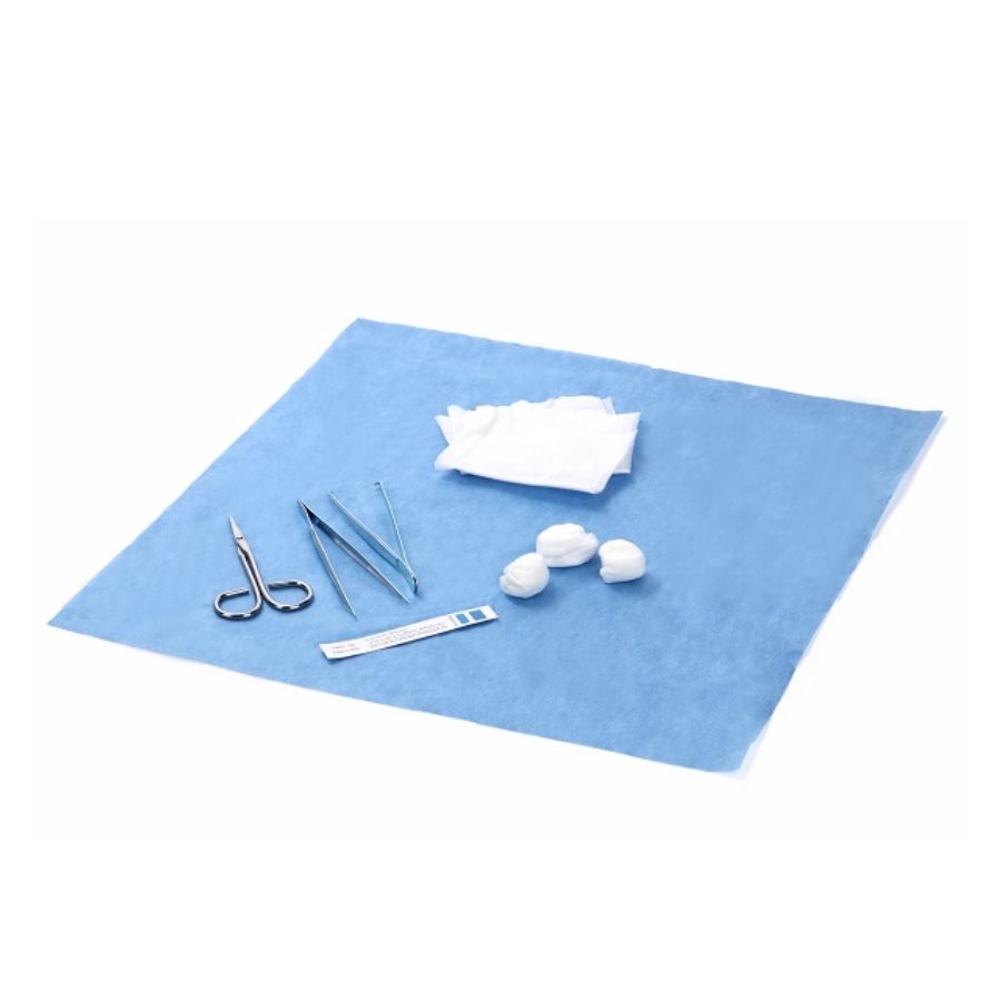 Spunlace guličky, 35g/m² spunlace, 3 ks Jednorazové obväzové kliešte, kovové, špicatý hrot, 12 cm, 1 ks Kliešte na tkanivá, kovové, 12 cm, 1 ks Podložky spunlace, 14,5 x 19,35 cm, zložená veľkosť 7,25 x 9,75 cm, 4-vrstvové, 3 ks Nožnice na odstraňovanie stehov, kovové, 14 cm, 1 ks Podnos, 17 x 11 cm, 1 ks Zavinovačka, 40 x 40 cm, 35 g/m² SMS netkaná textília, 1 ks Karta indikátora sterilizácie, 1 ks |